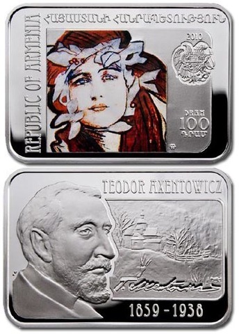 100 драм 2010 год. Армения. Теодор Аксентович Художник. Серебро