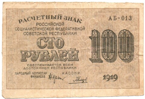 100 рублей 1919 год - РСФСР - Серия АБ-013