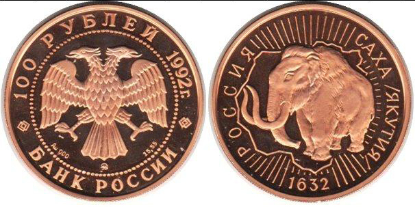 Аверс: вверху вдоль канта номинал «100 рублей» и год выпуска «1992 г.», внизу слова «БАНК РОССИИ». В середине в ободке из точек двуглавый орел под ним с внутренней стороны точечного ободка слева химическое название «Au» и проба «900» металла, далее направо монограмма монетного двора «ММД» и чистый вес находящегося в монете драгоценного металла «15,55».