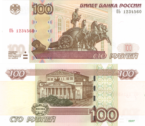 100 рублей 1997 г. Красивый номер - лесенка 1234560. Пресс UNC