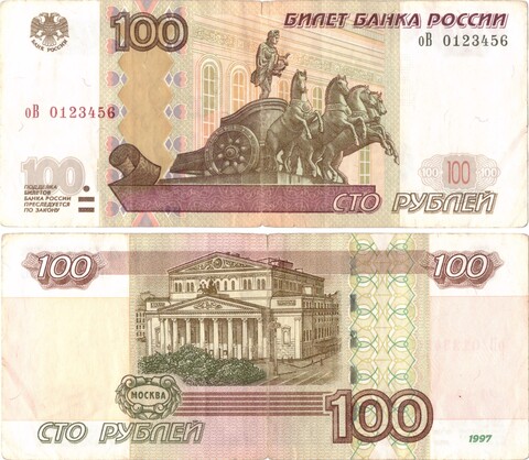 100 рублей 1997 год Модификация 2004. Красивый номер Лесенка оВ 0123456