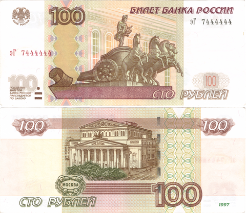 100 рублей 1997 (модификация 2004) Красивый номер эГ 7444444 XF-AU