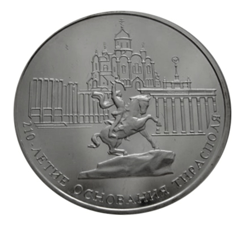 На оборотной стороне монеты: Изображение: вверху Собор Рождества Христова, внизу памятник основателю города А.В. Суворову, справа фрагмент здания Городского Совета, слева фрагмент здания Дома Правительства и Верховного Совета ПМР. Внизу по кругу надпись "210-ЛЕТИЕ ОСНОВАНИЯ ТИРАСПОЛЯ".