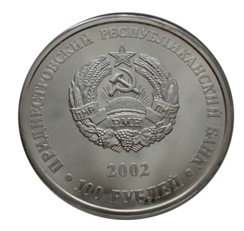 На лицевой стороне монеты: в центре изображение государственного герба Приднестровской Молдавской Республики, по кругу надписи: вверху - "ПРИДНЕСТРОВСКИЙ РЕСПУБЛИКАНСКИЙ БАНК"; внизу - "100 РУБЛЕЙ". В нижней части год выпуска - "2002".