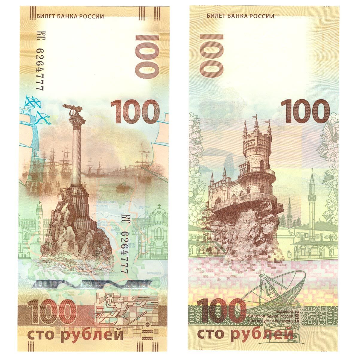 100 рублей 2015 г. Крым-Севастополь. Серия: -КС- Красивый номер №6264777 UNC