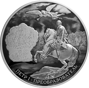 На оборотной стороне серебряной монеты номиналом 100 рублей расположены рельефные изображения Петра I верхом на коне и ангела, венчающего Петра I венком победителя, на фоне выполненного в технике лазерного матирования панорамного вида сражения; слева расположено растровое изображение, представляющее собой сцены сражений — сухопутного и морского, видимые поочередно при изменении угла зрения; внизу по окружности имеется рельефная надпись: «ПЕТР I • ПРЕОБРАЗОВАТЕЛЬ».