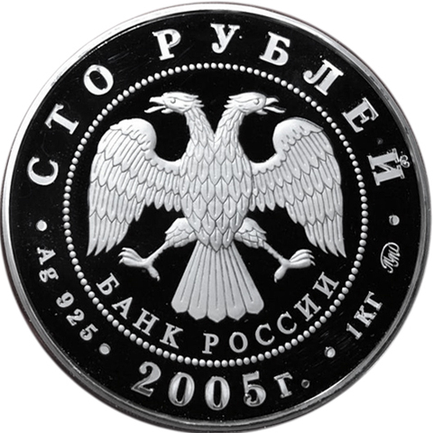 Аверс: вверху вдоль канта номинал «СТО РУБЛЕЙ», внизу слева химическое название «Ag» и проба «925» металла, внизу по центру год выпуска «2005 г.», внизу справа чистый вес находящегося в монете драгоценного металла «1000,0» и монограмма монетного двора «ММД». В середине в ободке из точек двуглавый орел под ним с внутренней стороны точечного ободка слова «БАНК РОССИИ».