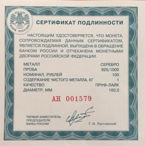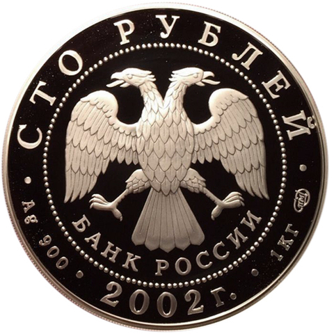 Аверс: вверху вдоль канта номинал «СТО РУБЛЕЙ», внизу слева химическое название «Ag» и проба «900» металла, внизу по центру год выпуска «2002 г.», внизу справа чистый вес находящегося в монете драгоценного металла «1000,0» и монограмма монетного двора «СПМД». В середине в ободке из точек двуглавый орел под ним с внутренней стороны точечного ободка слова «БАНК РОССИИ».
