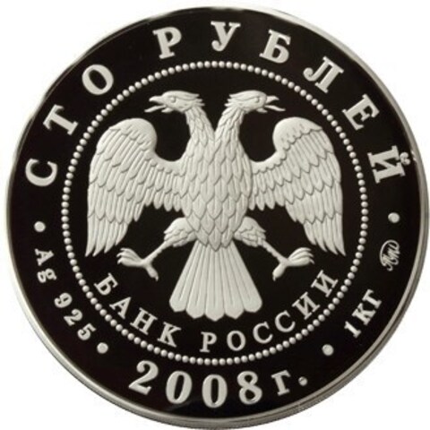 Аверс: вверху вдоль канта номинал «СТО РУБЛЕЙ», внизу слева химическое название «Ag» и проба «925» металла, внизу по центру год выпуска «2008 г.», внизу справа чистый вес находящегося в монете драгоценного металла «1000,0» и монограмма монетного двора «ММД». В середине в ободке из точек двуглавый орел под ним с внутренней стороны точечного ободка слова «БАНК РОССИИ».
