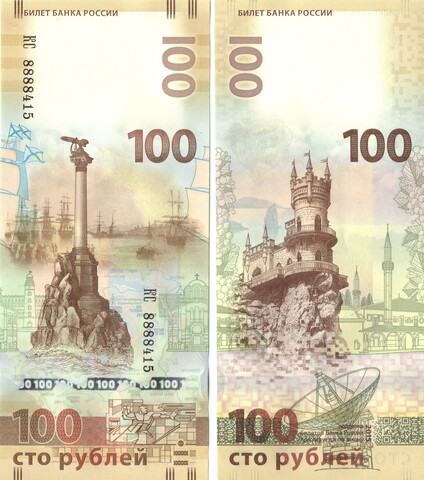 100 рублей Крым Красивый номер КС 8888415 пресс UNC