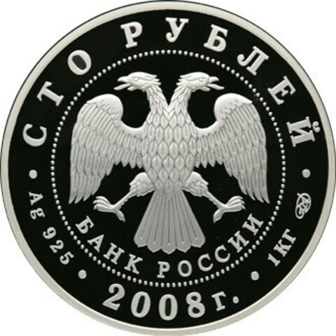 Аверс: вверху вдоль канта номинал «СТО РУБЛЕЙ», внизу слева химическое название «Ag» и проба «925» металла, внизу по центру год выпуска «2008 г.», внизу справа чистый вес находящегося в монете драгоценного металла «1000,00» и монограмма монетного двора «СПМД». В середине в ободке из точек двуглавый орел под ним с внутренней стороны точечного ободка слова «БАНК РОССИИ».