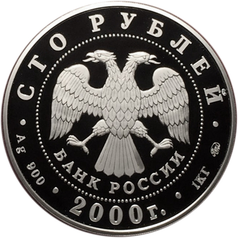 Аверс: вверху вдоль канта номинал «СТО РУБЛЕЙ», внизу слева химическое название «Ag» и проба «900» металла, внизу по центру год выпуска «2000 г.», внизу справа чистый вес находящегося в монете драгоценного металла «1000,0» и монограмма монетного двора «ММД». В середине в ободке из точек двуглавый орел под ним с внутренней стороны точечного ободка слова «БАНК РОССИИ».