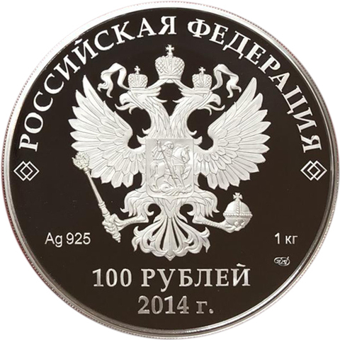 Аверс: сверху вдоль края монеты слова «РОССИЙСКАЯ ФЕДЕРАЦИЯ» под ними орел со скипетром и державой с Государственного герба Российской Федерации, слева от орла химическое название «Ag» и проба «925» металла, справа от орла чистый вес находящегося в монете драгоценного металла «1 кг» и под ним монограмма монетного двора «СПМД», ниже обозначение достоинства монеты «100 рублей» и под ним год проведения XXII Олимпийских зимних игр в г. Сочи «2014 г.».