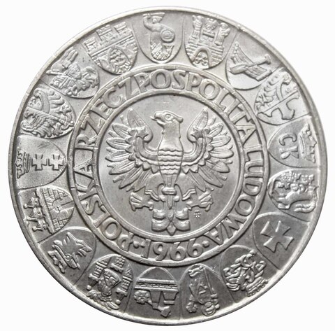 На монете изображен Мешка I и его первая жена Дубравка. Мешко I (ок. 935 - 25 мая 992) -первый исторически достоверный польский князь, представитель династии Пястов, сын Земомысла, внук Лешека. Основатель древнепольского государства; объединил большинство земель лехитских племён. В 966 году Мешко I со своими приближенными принял христианство по латинскому (католическому) обряду. В течение нескольких десятилетий новая религия и письменность на латинском языке распространились по всей Польше.