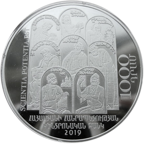 На аверсе монеты изображен фрагмент стелы посвящённой армянским учёным которая находится на входе в Ереванский государственный университет. Также на аверсе располагается надпись “SCIENTIA POTENTIA EST” И указан номинал монеты “1000” “ԴՐԱՄ”.