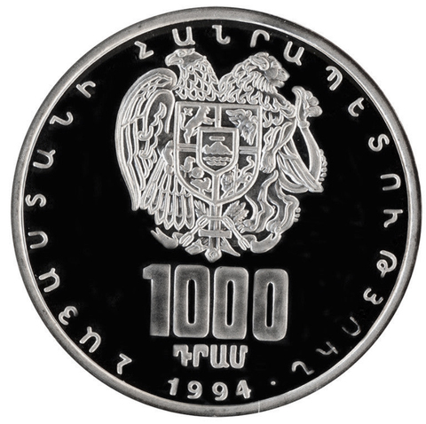 Реверс: изображение женщины с прялкой с банкноты в 250 рублей образца 1919 года, по краю — надпись на арм. ՀԱՅԿԱԿԱՆ ԴՐԱՄՆԵՐ ԹՂԹԱԴՐԱՄԻ 75 ՏԱՐԻՆ — «75 лет наличным деньгам Армении» и окантовка из точек.