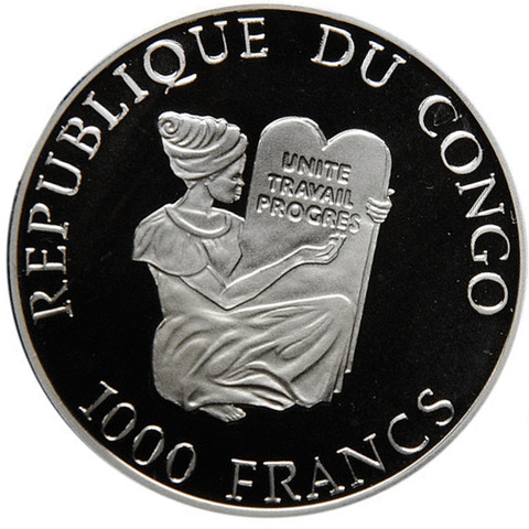 1000 франков. Чемпионат мира по футболу во Франции 1998 (Мяч, Эйфелевая башня). Конго. 1996 г. Серебро