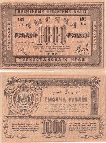 1000 рублей 1920 год кредитный билет Туркестанского Края