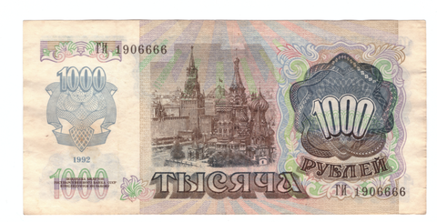 1000 рублей 1992 года с красивым номером ГИ 1906666. F