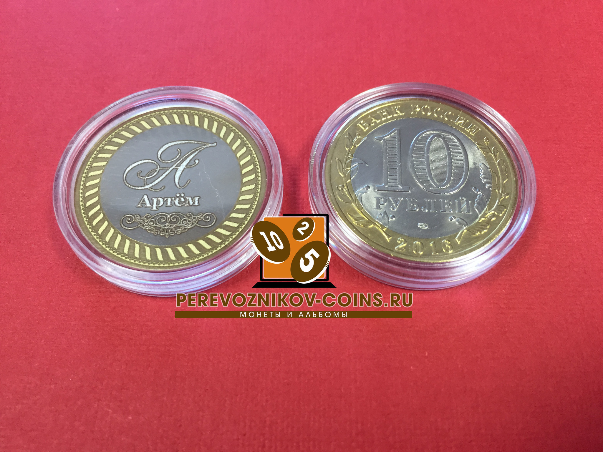 Сувенирная монета "Артем" номиналом 10 рублей с выгравированным изображением.