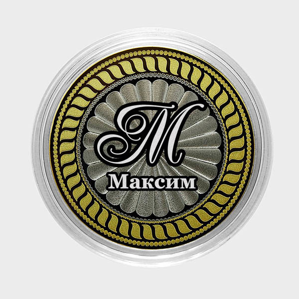Сувенирная монета "Максим" номиналом 10 рублей с выгравированным изображением.