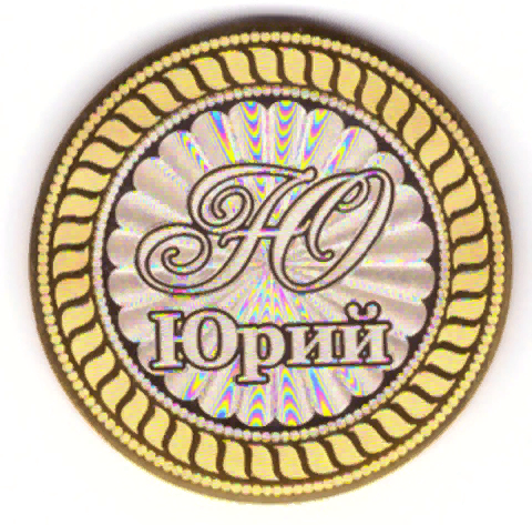 Сувенирная монета "Юрий" номиналом 10 рублей с выгравированным изображением.