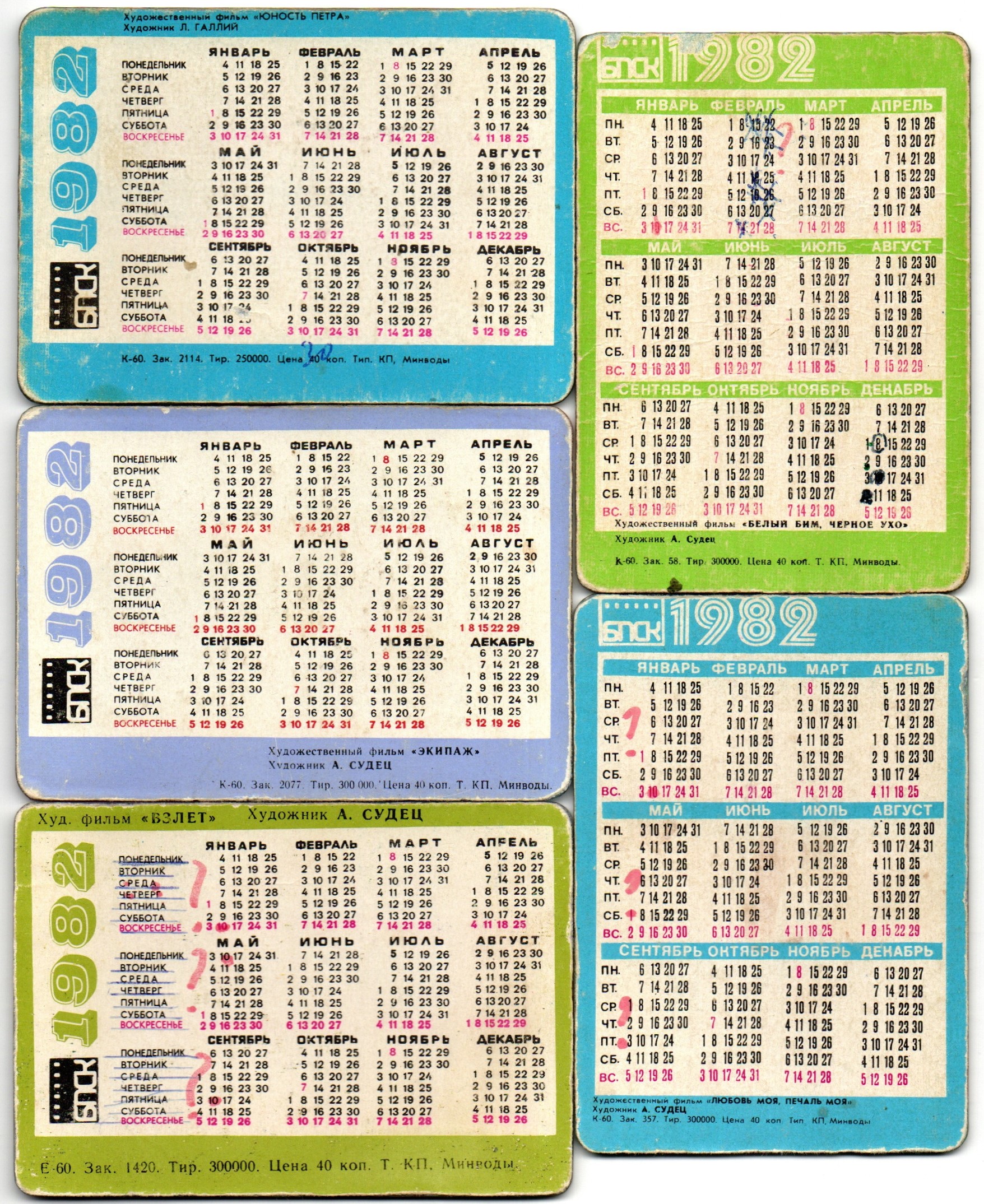 № 116 Набор из 5 переливных (стерео) Календариков . Художественные фильмы СССР 1982 год.
