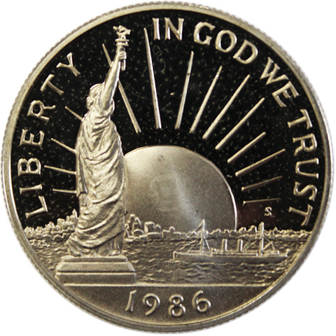 Аверс: изображение статуи Свободы на фоне восходящего солнца.