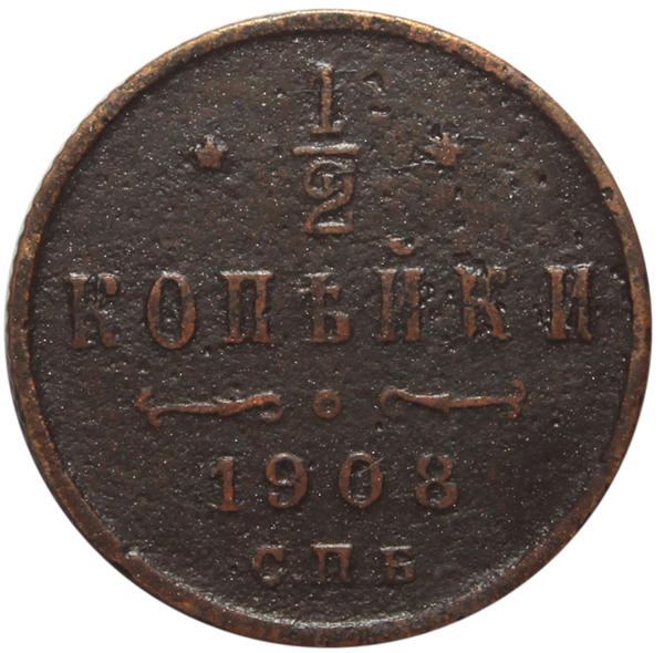 Реверс: вверху монеты обрамленный слева и справа звездочками номинал монеты - цифра «1/2», ниже слово «КОПЕЙКИ», под ним две направленные в разные стороны фигурные черты, ниже год выпуска монеты «1908» и под ним обозначение монетного двора «СПБ».