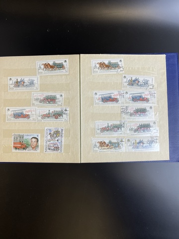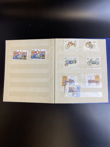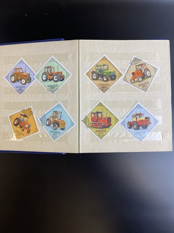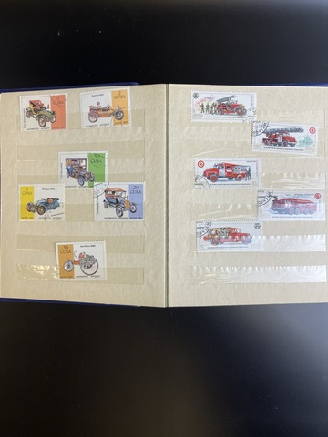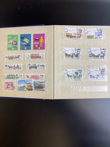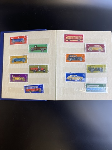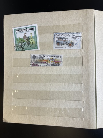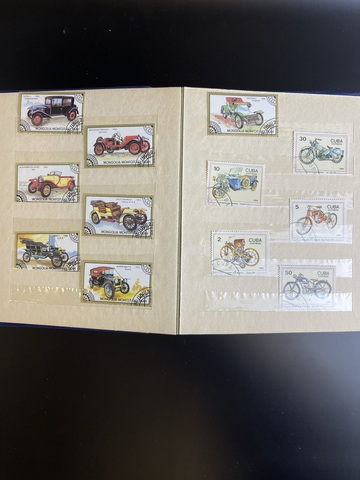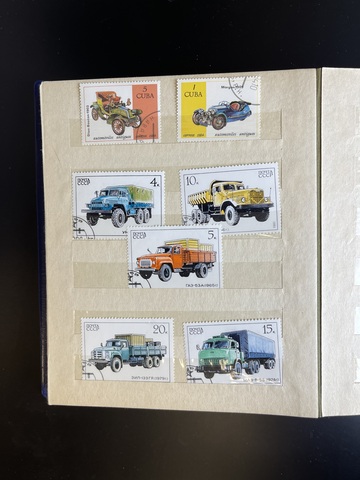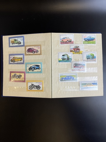 130 марок в альбоме СССР на разные тематики: автомобили грузрвые , легковые, автобусы, трактора, ГАИ, лошади, пожарники, мотоциклы. Марки разных стран : СССР, Монголия, Куба, Польша, Чехословакия. Есть свободные листы для добавления марок