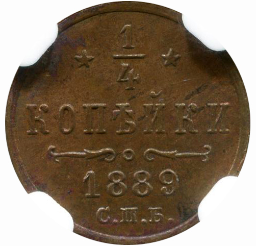 Реверс: В центре указан номинал «1/4», ограниченный с обеих сторон звездочками. Под цифрой номинала слово — "КОПЕЙКИ". Ниже, расположен декоративный разделитель в виде двух изогнутых линий и небольшой окружности между ними. Под линиями год выпуска монеты "1889" и под ним обозначение монетного двора «С.П.Б.».