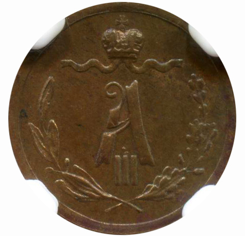 Аверс: В центре вензель Александра III. Над ним Корона Российской империи с двумя развевающимися концами ленты Ордена Святого апостола Андрея Первозванного. Под вензелем, вдоль канта, две скрещенные ветви: слева лавровая, справа дубовая.