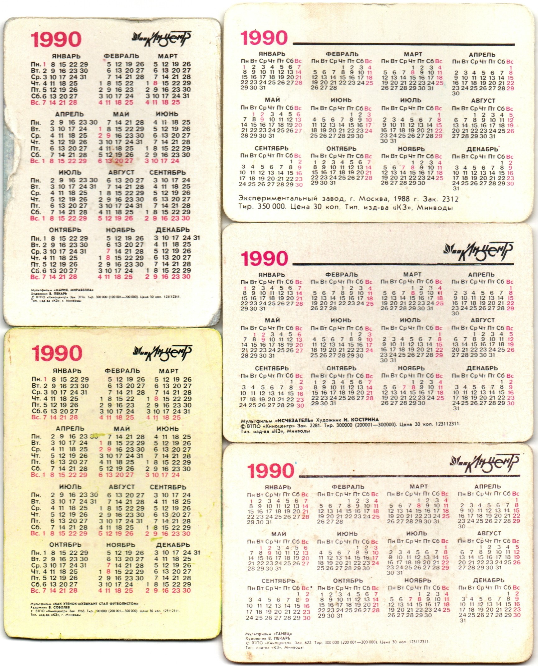 № 140 Набор из 5 переливных (стерео) Календариков . Мультфильмы СССР 1990 год.