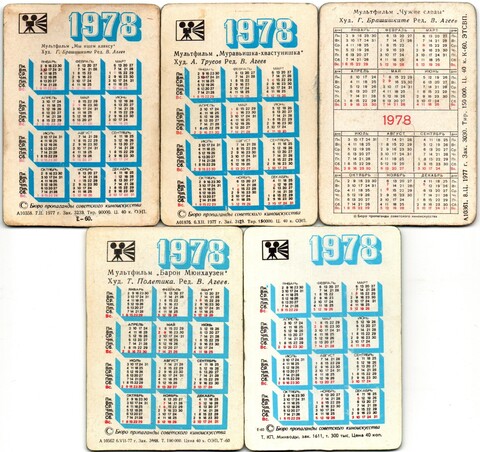 № 142 Набор из 5 переливных (стерео) Календариков . Мультфильмы СССР 1978 год.