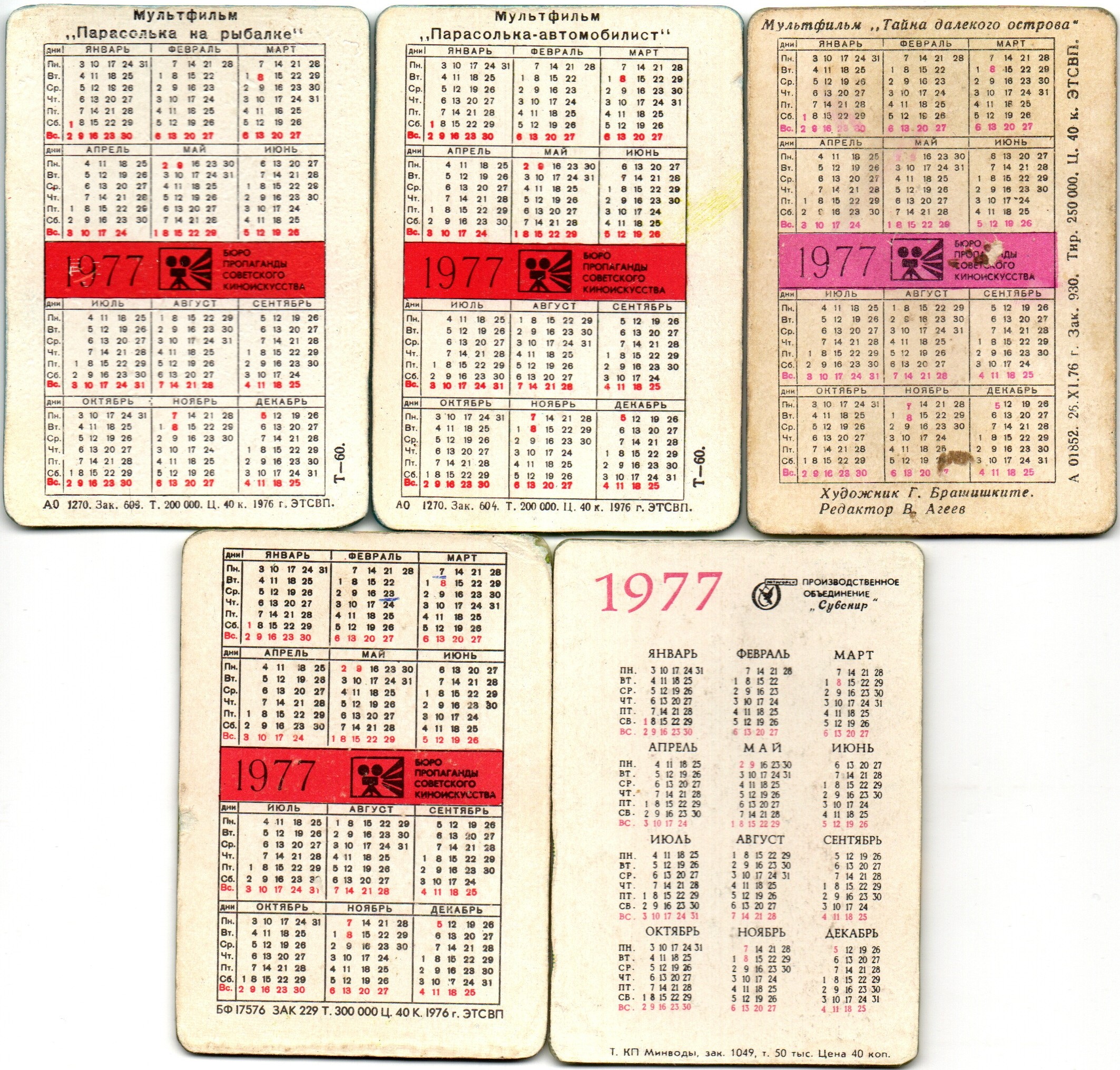 № 146 Набор из 5 переливных (стерео) Календариков . Мультфильмы СССР 1977 год.
