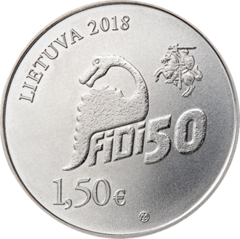 Аверс: стилизованный динозавр, главный символ веселого фестиваля академической молодежи - 50-й день физиков Вильнюсского университета. Рядом с ним находится Витис, герб Литовской Республики. На монете также есть надписи LIETUVA (ЛИТВА), 2018, номинал 1,50 евро и логотип Литовского монетного двора.