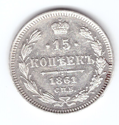Реверс: В центре указан номинал «15», ограниченный с обеих сторон шестиконечными звездочками. Над цифрой – Корона Российской империи. Под цифрой номинала — слово "КОПЕЕК". Ниже, расположен декоративный разделитель в виде двух разнонаправленных фигурных линий и стилизованным из точек крестом между ними. Под разделителем — дата выпуска монеты «1861». Под цифрой даты — обозначение монетного двора «С.П.Б.». Вдоль канта, не доходя до короны, изображен венок из лавровой и дубовой ветви, которые в нижней части перевязаны лентой на узел бантом. По окружности канта имеются рельефные элементы, выполненные в виде зубцов.