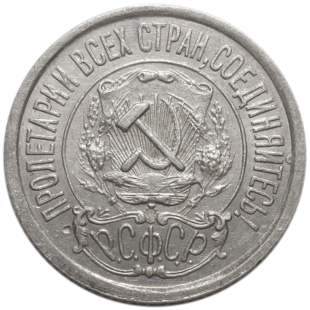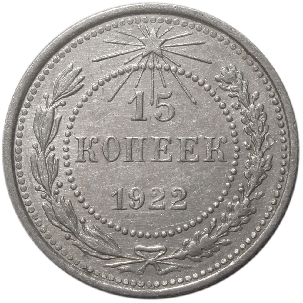 Реверс: в центре в кольце из точек указан номинал в две строки - "15 КОПЕЕК", под ним - год чеканки - "1922". В нижней и боковых частях монеты имеется венок из лавровой (слева) и дубовой (справа) ветвей, связанных внизу бантом. Вверху стилизованно изображено солнце в виде пятиконечной звезды с лучами. Нижние 5 лучей заходят в кольцо с обозначением номинала. Вдоль всего канта непрерывно тянется кольцо из точек.
