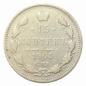 Реверс: слева вдоль края монеты лавровая ветвь, справа дубовая, внизу ветви соединяются и перевязаны лентой, в середине вверху Корона Российской империи, под ней обрамленный слева и справа звездочками номинал монеты - цифра «15», ниже слово «КОПЕЕК», под ним две направленные в разные стороны фигурные черты и ниже год выпуска монеты «1905», под ним обозначение монетного двора «СПБ».