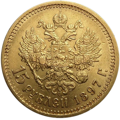 Аверс: в середине Малый Государственный Герб Российской империи, под ним вдоль края монеты номинал «15 РУБЛЕЙ» и год выпуска монеты «1897 Г.».
