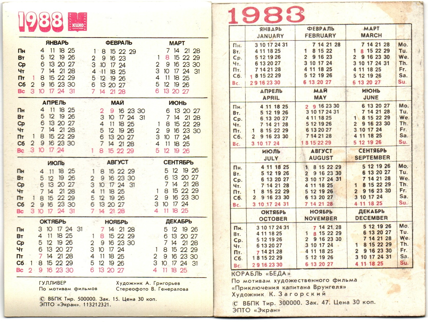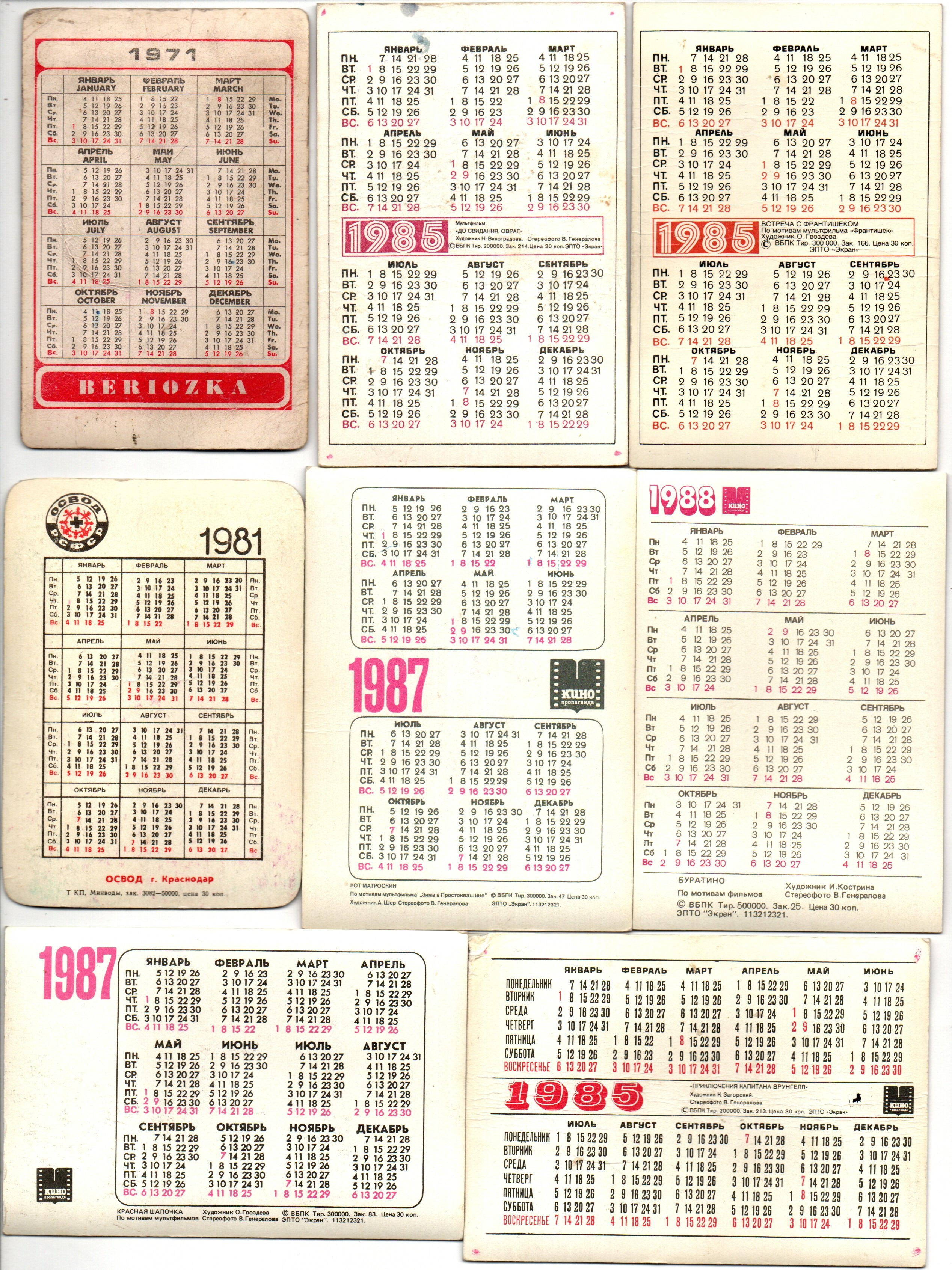 № 155 Набор из 10 объёмных стерео Календариков СССР 1985 год. Советские мультфильмы . Художники СССР. Встреча с Франтишеком / Приключения капитана Врунгеля / До свидания , овраг / Березка / освод / Корабль Беда / Красная шапочка / Кот Матроскин / Буратино / Гулливер Особенности: В комплекте: 10 разных календариков с ограниченным тиражом Яркая печать и чёткая детализация Плотный пластик, устойчивый к износу Карманный формат — удобно хранить или коллекционировать Для кого подойдёт: Коллекционерам советской атрибутики Поклонникам классической анимации В подарок родителям и друзьям — для тёплой ностальгии Для оформления альбома или тематической коллекции Набор станет приятным сувениром и атмосферным напоминанием о добрых Мультфильмы, знакомых с детства. Отличный вариант подарка или пополнения личной коллекции . Состояние на фото