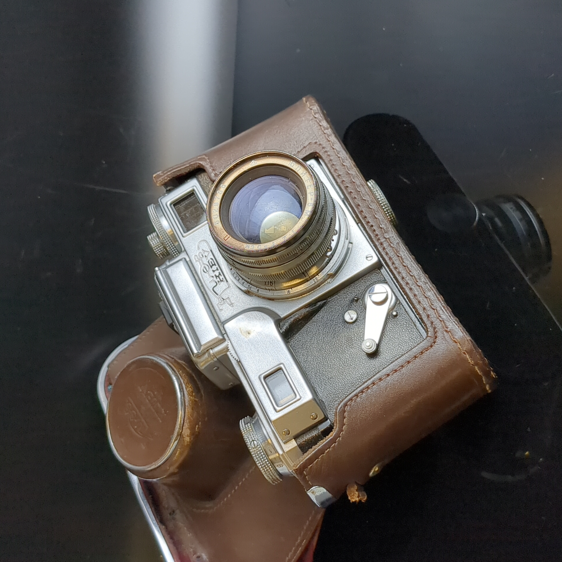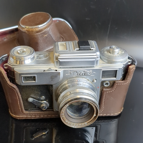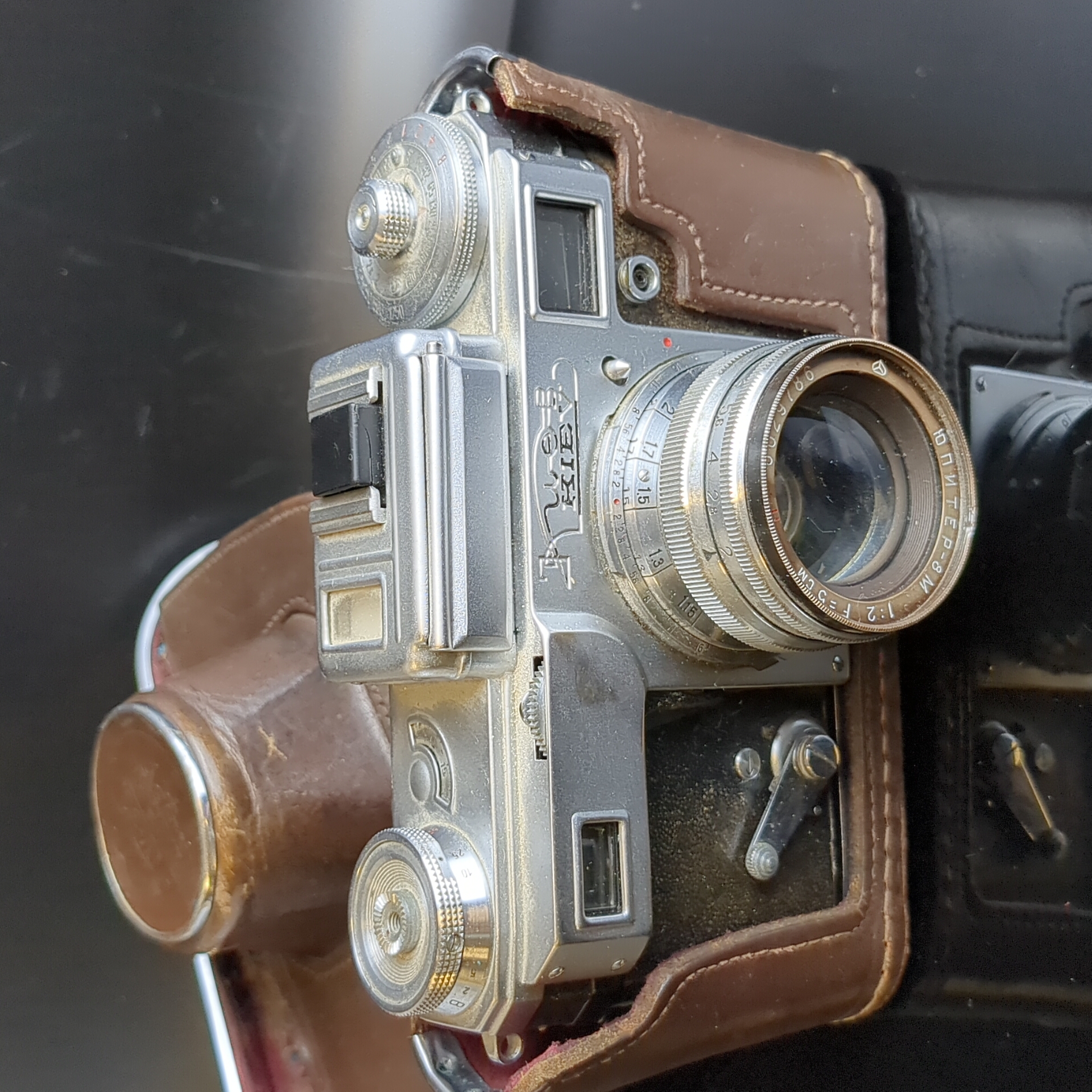 №19 Фотоаппарат "Киев 4" с объективом "Юпитер 8-М" в оригинальном футляре, металл, Киевский завод "Арсенал", СССР, 1957-1979 гг. Присутствуют следы использования. Состояние на фото