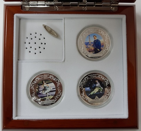Набор монет упакован в музыкальный футляр с механическим заводом, который может проигрывать мелодию из балета П.И. Чайковского «Лебединое озеро».