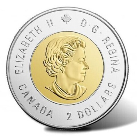 На реверсе монеты изображен портрет королевы Елизаветы II и надпись «ELIZABETH II DG REGINA CANADA 2 DOLLARS».