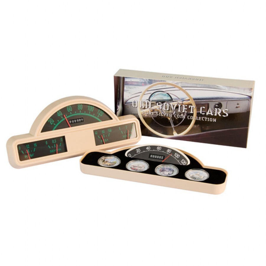 Реверс: В центре - цветное изображение знаменитой машины Москвич-400, на фоне цветного изображения вечернего здания Москвы. По краю - рельефное изображение автомагнитолы старого образца. Снизу надписи: OLD SOVIET CARS (Старые советские автомобили), модель автомобиля MOSKVICH 400 и характеристика металла 999 SILVER (серебро 999 пробы).