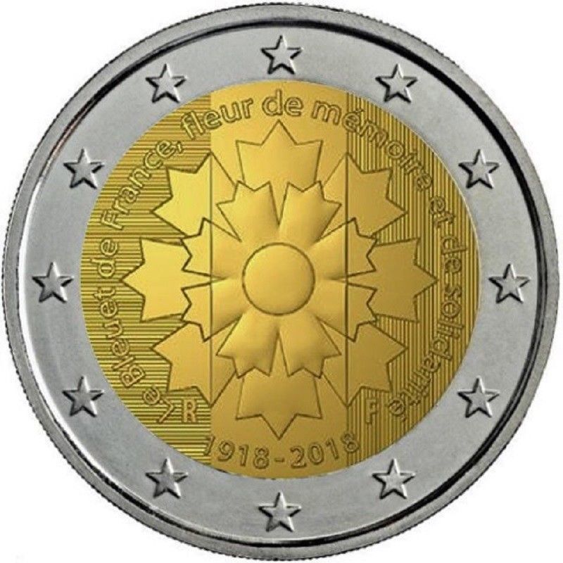Аверс: цветок василька. Надпись «Le Bleuet de France, fleur de memoire et the solidarite 1918 — 2018».
