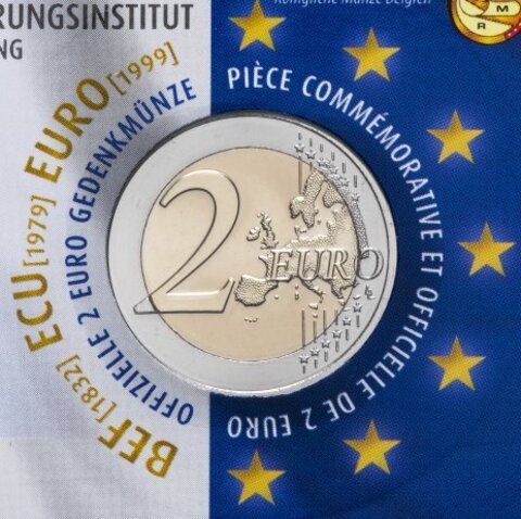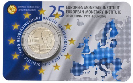 в центре портрет Александра Ламфалусси, первого президента Европейского валютного института. Слева вдоль края диска расположена надпись «European Monetary Institute». В центральной части выгравирован год создания финансового учреждения «1994», ниже аббревиатура — «EMI». Ещё ниже — стилизованные монеты с надписями «€», «ECU» и «BEF» сверху вниз. Слева от «монет» расположены знак генерального директора Королевского монетного двора Бельгии (Ingrid van Herzele, герб) и знак Королевского монетного двора Нидерландов (посох Меркурия). По портретом указано имя «A.Lamfalussy". Ниже — обозначение государства «BE» и год эмиссии монеты «2019». Справа от портрета — инициалы дизайнера монеты «LL».