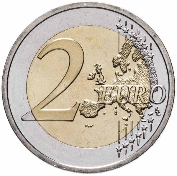 стандартное изображение для монет 2 евро – номинал монеты на фоне карты Европы.