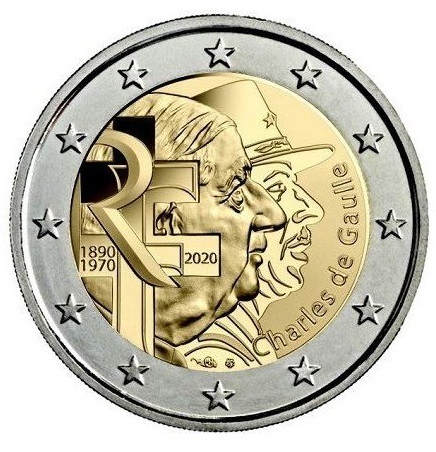 2 евро. 50 лет со дня смерти Шарля де Голля и 80-летие обращения 18 июня. Франция. 2020 год