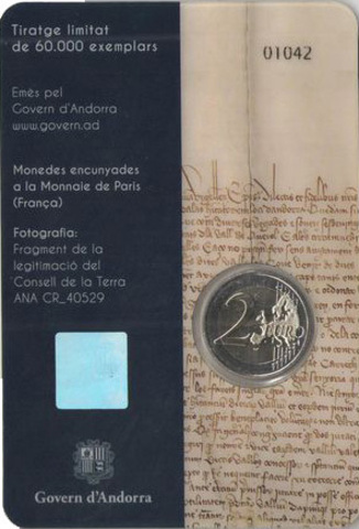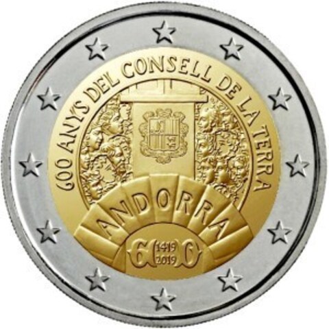 2 евро Андорра - 600 лет генеральному совету долин Андорры. 2019 год